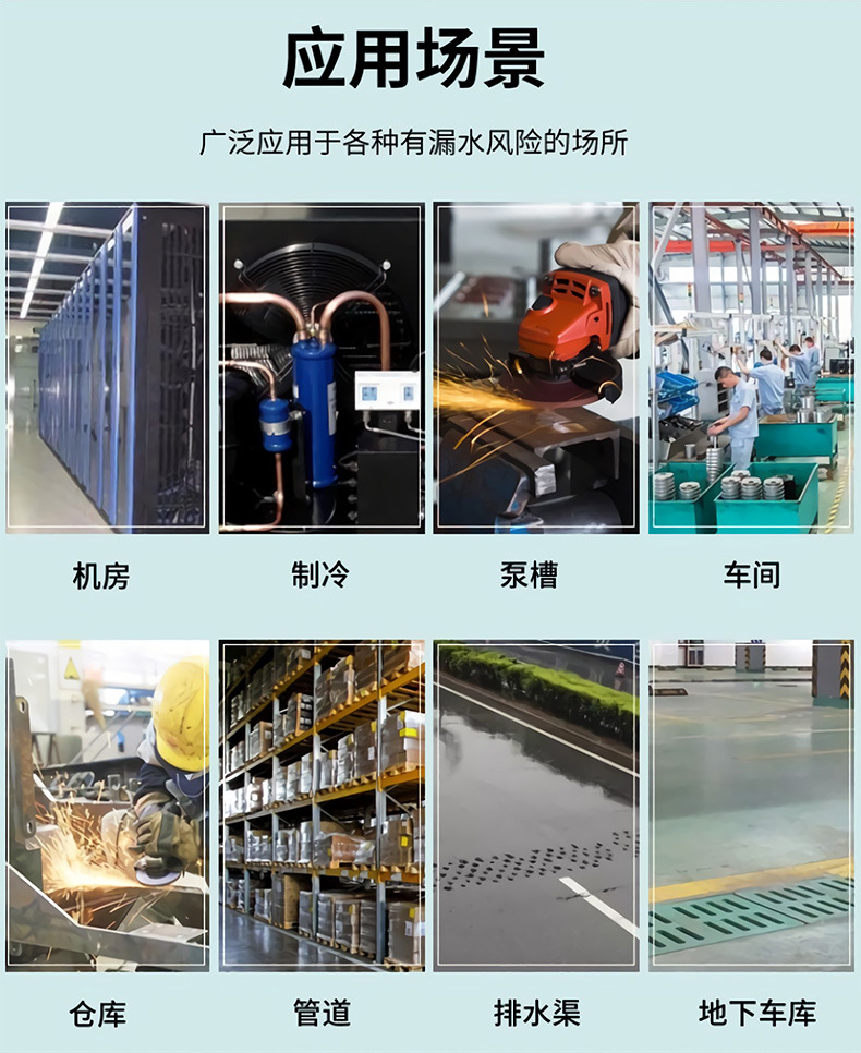 该水浸探测器适用于通讯基站、宾馆、饭店、精密机房、图书馆、仓库或监控机房以及其他在有积水需要报警的场所。