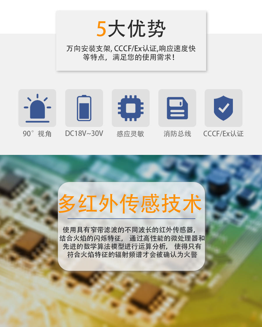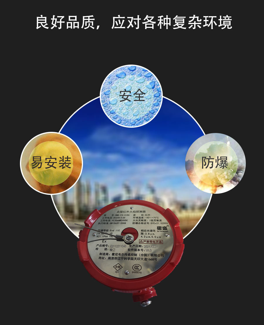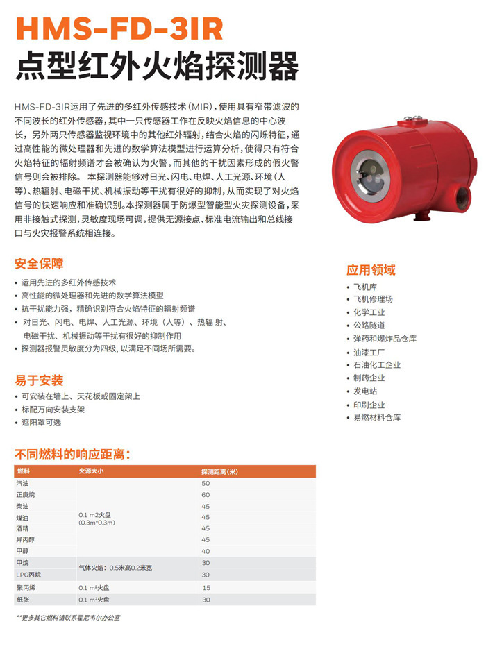 霍盛 霍尼韦尔火焰探测器 HMS-FD-3IR 三线 4-20ma 点型红外火焰探测器霍尼韦尔霍盛HMS-FD-3IR点型红外火焰探测器它运用了先进的多红外传感技术(MIR),使用具有窄带滤波的不同波长的红外传感器,其中一只传感器工作在反映火焰信息的中心波长,另外两只传感器监视环境中的其他红外辐射,结合火焰的闪烁特征,通过高性能的微处理器和先进的数学算法模型进行运算分析,使得只有符合火焰特征的辐射频谱才会被确认为火警,而其他的干扰因素形成的假火警信号则会被排除。本探测器能够对日光、闪电、电焊、人工光源、环境(人等)、热辐射、电磁干扰、机械振动等干扰有很好的抑制,从而实现了对火焰信号的快速响应和准确识别。本探测器属于防爆型智能型火灾探测设备,采用非接触式探测,灵敏度现场可调,提供无源接点、标准电流输出和总线接口与火灾报警系统相连接。 -