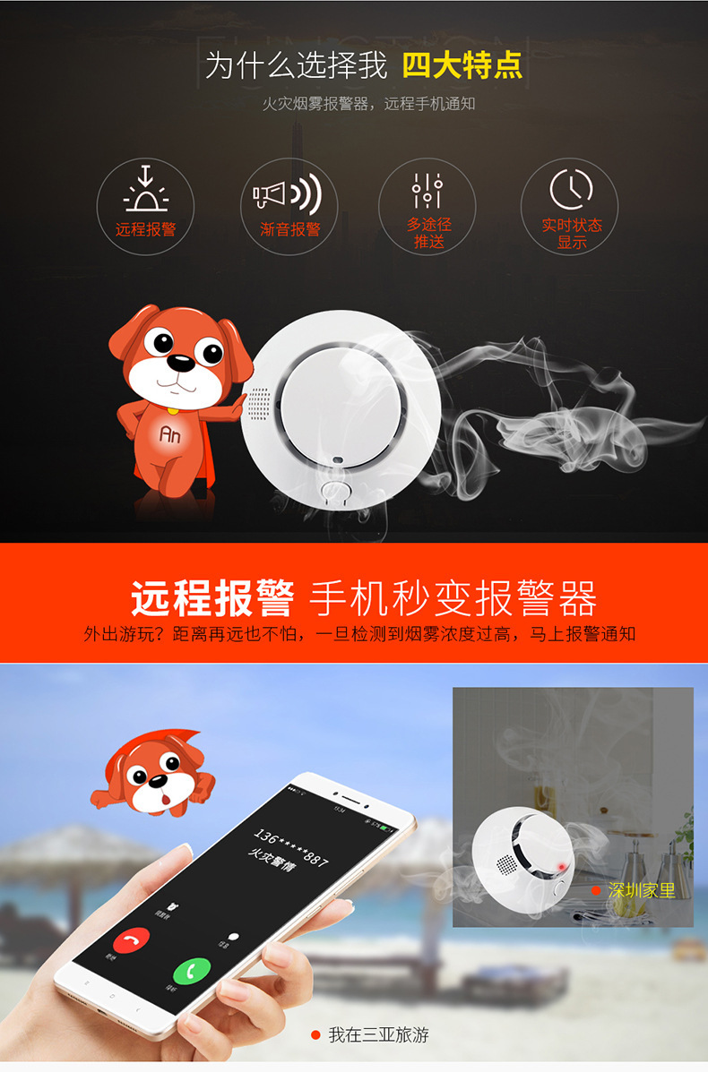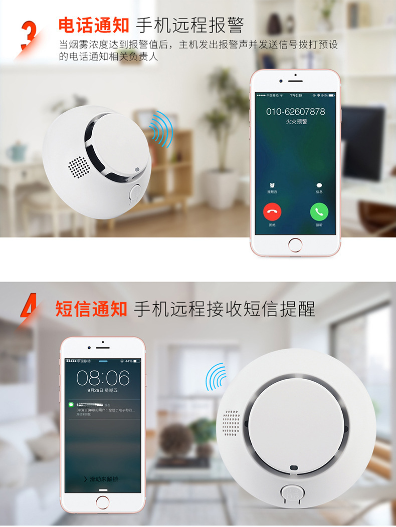 行火灾安全监控。报警器内置蜂鸣器,报警后发出强烈的声响,同时具有消音功能。